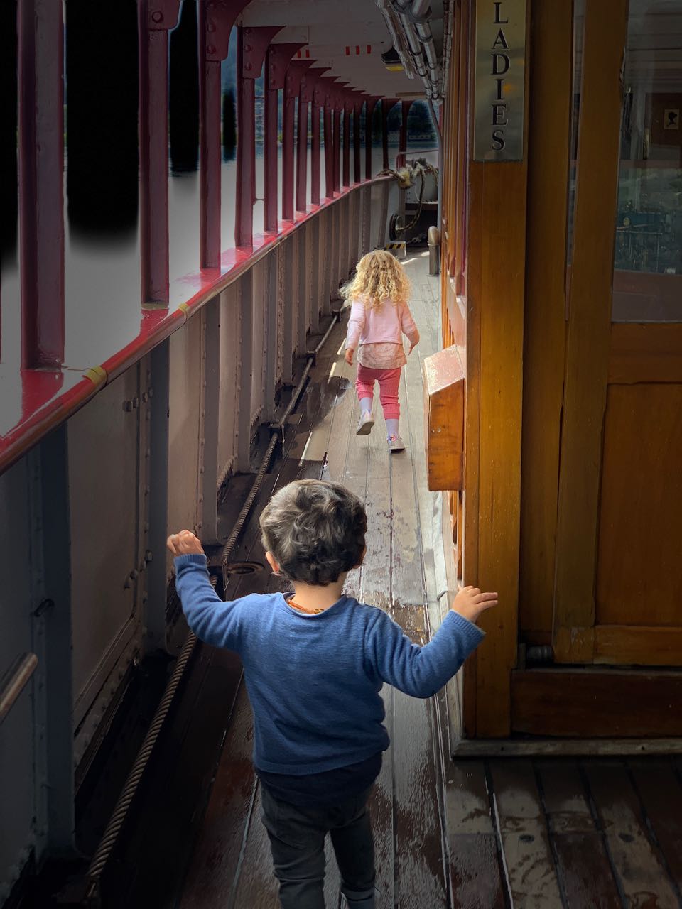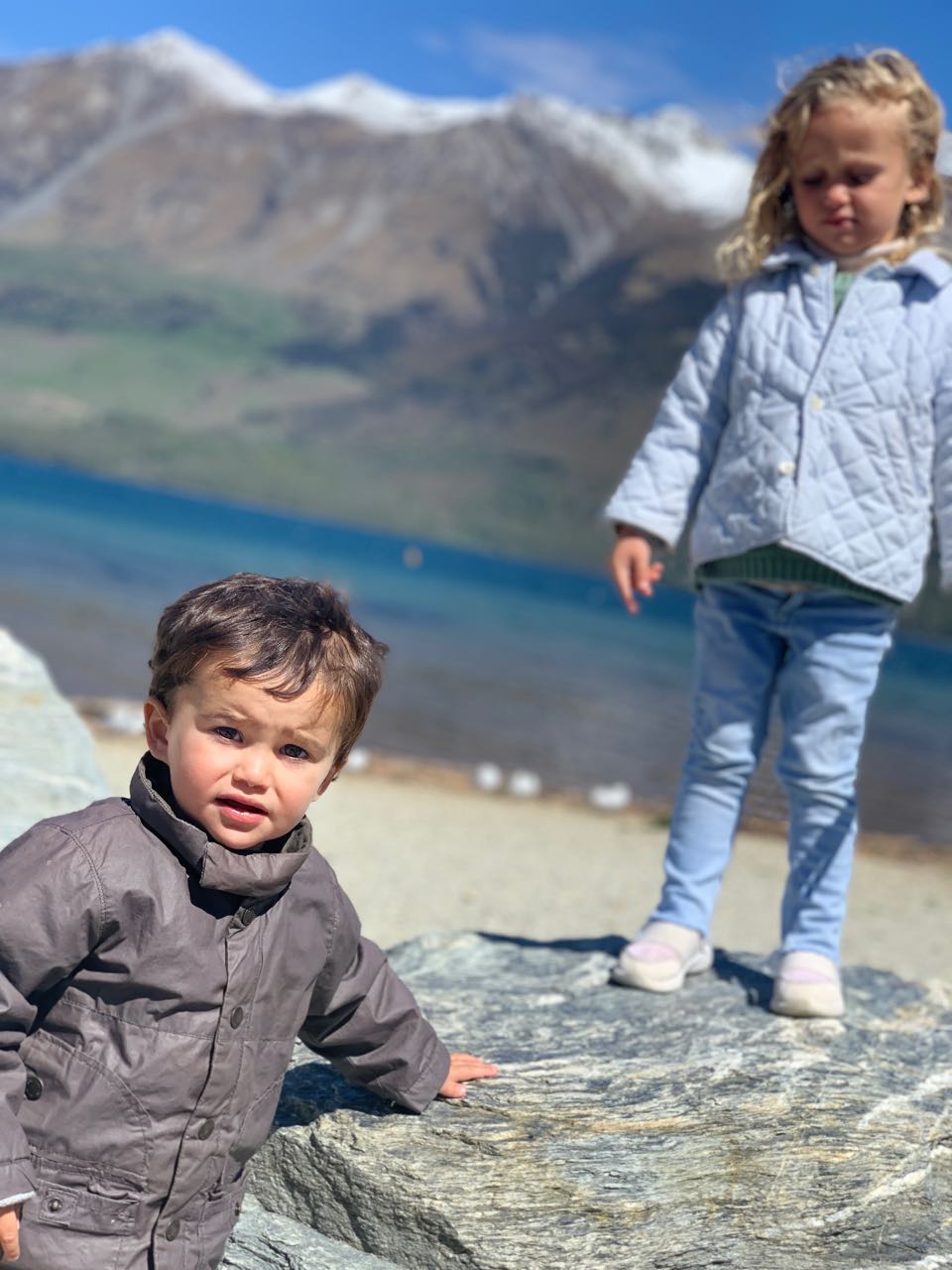 A fantastic, easy tour, starting with an incredibly scenic journey across Lake Wakatipu from the middle of Queenstown Wharf on the historic 105 year old coal powered steamer called The SS ‘Earnslaw'. The children loved this boat. They were playing hide and seek, running up and down the 3 different levels, peering through the round lower windows. The coal fired steam engine room is opened for people to see so Clemente spent a big part of the trip learning about steam power, pistons, crankshafts, compression chambers and release valves (his father was clearly the one doing the teaching). We were very lucky with the weather, because even if it was cold, it was a bright blue sky day.